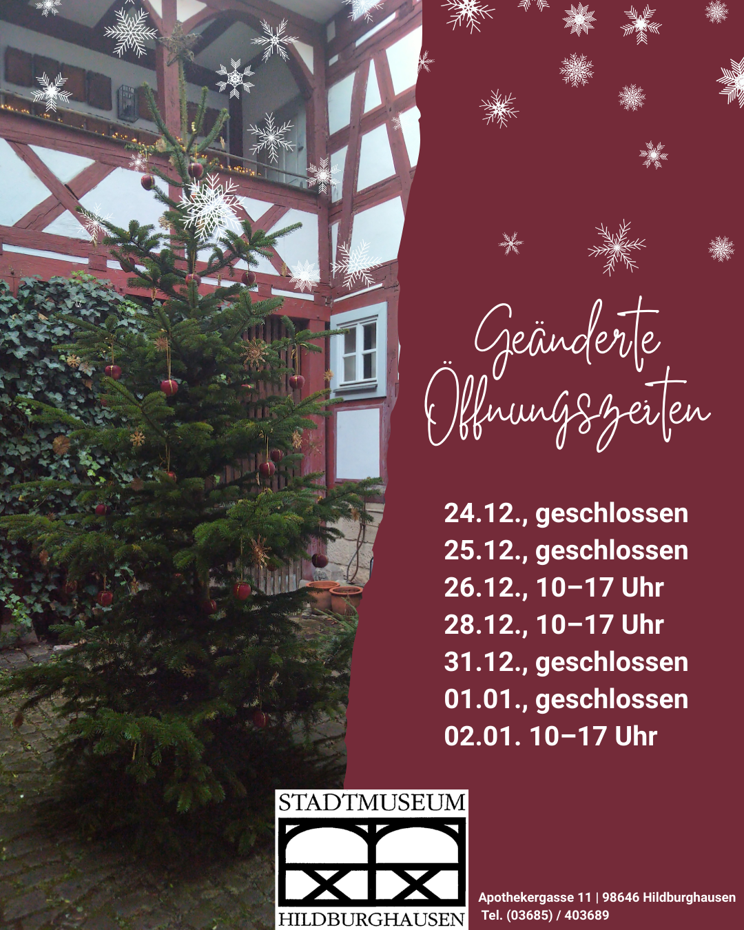 Über die Feiertage gelten im Stadtmuseum Hildburghausen besondere Öffnungszeiten: 24.12., geschlossen 25.12., geschlossen 26.12., 10–17 Uhr 28.12., 10–17 Uhr 31.12., geschlossen 01.01., geschlossen 02.01. 10-17 Uhr
