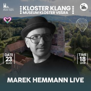 Hier trifft Vergangenheit auf pulsierende Gegenwart: Das Kloster wird zur Partyzone! Beim diesjährigen „Kloster Klang“ bringt Marek Hemmann mit seinem Sound das Headliner-Feeling in die Region. Unterstützt wird er von den angesagten DJs Danny B, Pepper und Flokati, die House, Techno und groovige Elektro-Beats in das einzigartige Ensemble bringen. Erlebt einen Sommerabend voller Rhythmus, Lebensfreude und überraschenden musikalischen Momenten – umgeben von Geschichte und Natur.